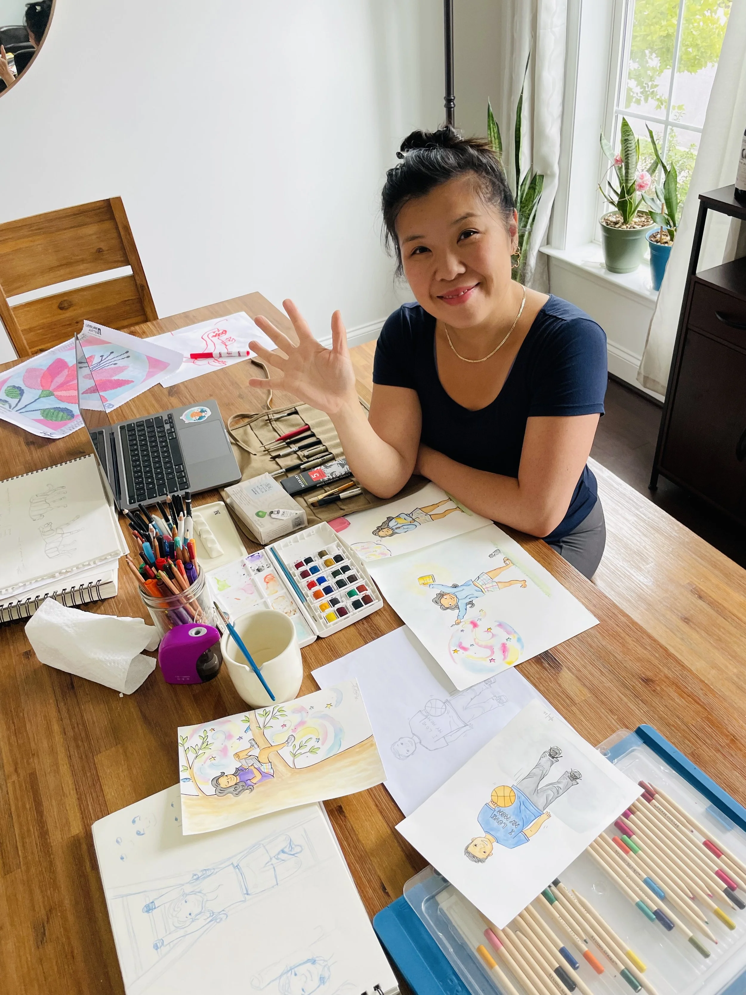 Hi, I’m Melissa! Originally from Brooklyn, NY, I am now a SCBWI illustrator based in Chicago, IL. I’m a mom of 3 (4 if you count the puppy… 6 if you count the guinea pigs!) with a background in yoga teaching, mental health & wellness counseling, and a lifelong passion for making things that spread joy. I especially love creating illustrations that are full of wonder, imagination, and possibility; art that can make a kid (of any age) feel understood and inspired to be more of who they already are.